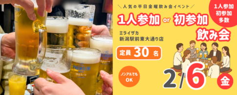 スタッフブログ&イベント告知 新潟市で、2/21(土)に「カラオケ大会」を開催します( ⸝⸝ ˘0˘) ¶ 2026.01.19新潟市で、2/6(金)に「1人参加or初参加飲み会」を開催します(*^▽^*)2026.01.16新潟市で、1/24(土)に「アンコール新年会」を開催します(*^▽^*)2026.01.07新潟市で、1/17(土)に「カラオケ大会」を開催します(○˘▿˘)♫2025.12.25新潟市で、1/16(金)に「1人参加or初参加飲み会」を開催します(*´ω`*)2025.12.23新潟市で、1/10(土)に「新年会」を開催します(∩´∀`)∩2025.12.23新潟市で、1/9(金)に「新年会」を開催します!(^^)!2025.12.232026年1月ボードゲームイベント情報2025.12.22 〉過去のブログはコチラから