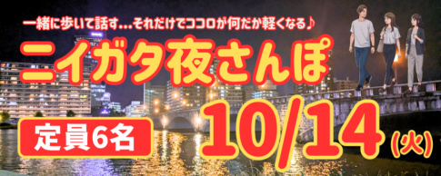 満員御礼 ほぼ満員 男性3名、女性2名のご参加です☆ ■日時 10月14日(火) 19:30~20:50(受付:19:15~19:25) ※雨や開催不可と判断した場合、中止になる場合がございます。 中止の場合、当日18時...